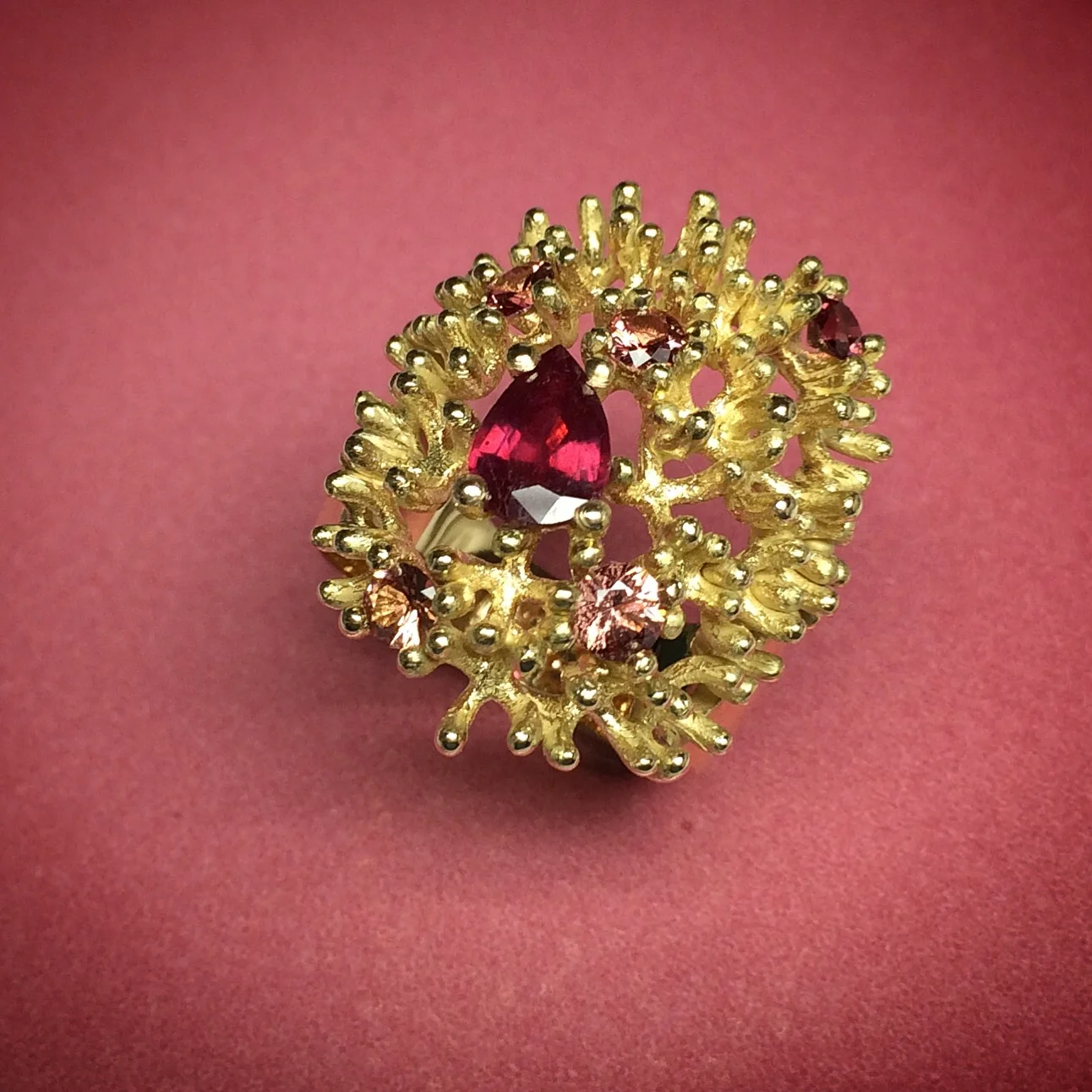 I had the pleasure of making a great commission for a customer; a gold ring in the coral collection with a large ruby and five spinels. For those not familiar with spinels I can recommend this article about the rather overlooked precious stones, that comes in a great variety of intriguing colours: http://www.guldsmed.dk/tinymce/jscripts/tiny_mce/plugins/filemanager/files/AuClock_2009_10_Spinellen.pdf
