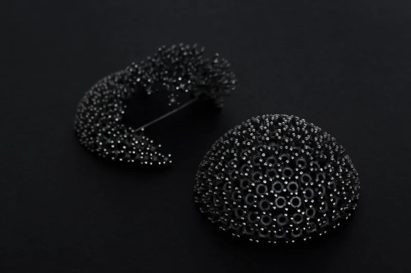 Broschen er lavet i sterling sølv og tager udgangspunkt i den lille fatning der skal til for at holde en sten på plads i et smykke, således at stenen præsenteres bedst muligt. Fatningerne er gentaget i korallignende strukturer der giver smykket et blødt, organisk og levende præg og distancerer det fra den meget stringente struktur som traditionelt præger juvellérarbejde. Ved et kig på tidligere tiders kronjuveler der ligger i alverdens skatkamre ribbet for sten, fik jeg øje på skønheden i det virvar af metal der ligger gemt bag de dyrebare sten og så dyrkede jeg det til fulde. Broschen er en del af en større serie af smykker med samme udgangspunkt.